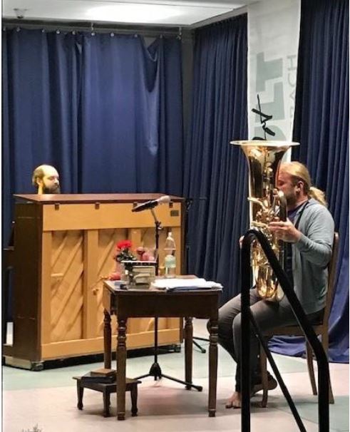 Die Künstler - Multi-Instrumentalist und Geschichtenerzähler Andreas Martin Hofmeir mit seiner Tuba, begleitet von dem Pianisten Johannes Billich auf dem Klavier, hatten ihren Auftritt ebenfalls zwei Jahre verschieben müssen. Vom lässigen Outfit und der Gesamterscheinung her - ganz im Gegensatz zu seinem Kollegen -präsentierte sich Hofmeir als ein Künstler, der Ungewohntes und scheinbar Unvereinbares auf unnachahmliche Weise zusammenbrachte. Da war einmal sein trockener Humor, die überraschenden und unerwarteten Pointen, immer im Kontakt mit seinem Publikum, fast beiläufig erzählte und nach eigenem Bekunden wahre, weil selbst erlebte skurrile Geschichten und Situationen, Beschreibungen seiner Heimat, dem Bayerischen Holledau mit der dortigen Hopfen-Monokultur und der Vergleich mit dem ebenfalls ländlichen Grünwettersbach, sein Einsatz beim nicht uneigennützigen Krötenretten, Wissenswertes über sein Instrument, die Tuba, und dem späten, aber letztlich zur Virtuosität führenden Zugang zum Instrument, ungewöhnliche Begegnungen und Auseinandersetzungen mit ganz normalen Zeitgenossen… Dazwischen Lesungen in Prosa und Gedichtform im unnachahmlichen, hintersinnigen und philosophischen Stil eines Karl Valentin, nachdenklich-melancholisch vorgetragen aus seinem zum Erwerb angepriesenen Buch.
