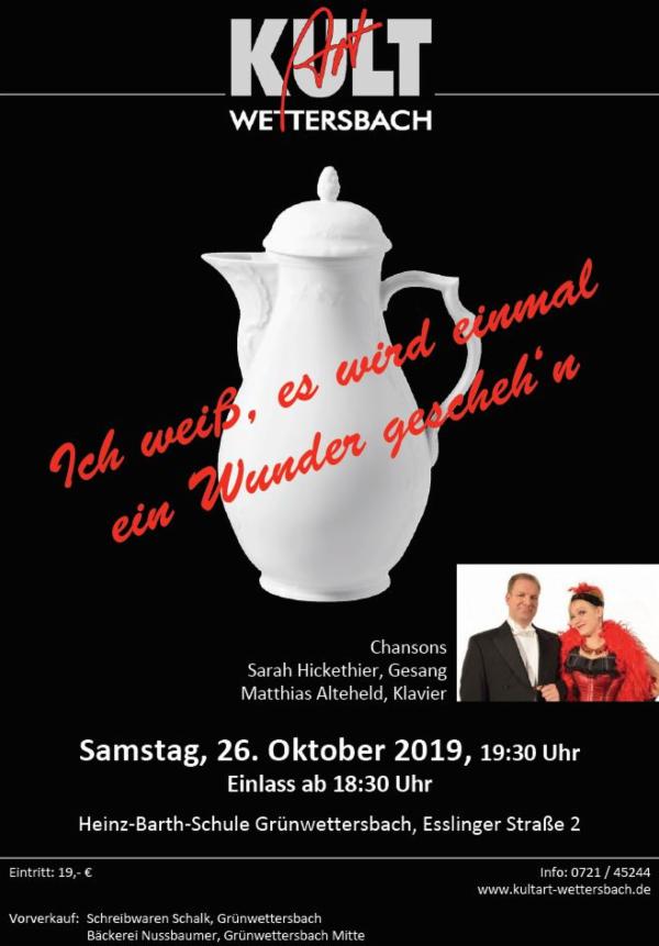 Die Zuhörer konnten, wie schon von allen früheren Veranstaltungen gewohnt, aus den kulinarischen Köstlichkeiten auswählen, die das Küchenteam wieder liebevoll vorbereitet hatte, und so den Abend auch noch länger im Gespräch mit den Künstlern, Freunden und Bekannten genießen. Das Programm von KultArt Wettersbach ist seit vielen Jahren zu einem festen Bestandteil der Kulturszene weit über die Grenzen des Bergdorfes hinaus geworden. Dabei kommen Chanson, Oper, Musical, Instrumentalmusik oder Stepptanz, Kabarett oder Malerei zur Aufführung – jedesmal sind die Fans hell begeistert über die alljährlichen Events im Oktober und feiern Künstlerinnen und Künstler in der stimmungsvoll dekorierten Aula der Heinz-Barth-Schule. Mit dem Erlös der Veranstaltungen erwirbt oder bezuschusst KultArt den Kauf von Objekten für den Skulpturenpfad zwischen Grünwettersbach und Palmbach – ein außergewöhnliches und viel beachtetes Projekt, das hochwertige Kunstwerke in ungewöhnlicher, öffentlichkeitsnaher Umgebung präsentiert.
